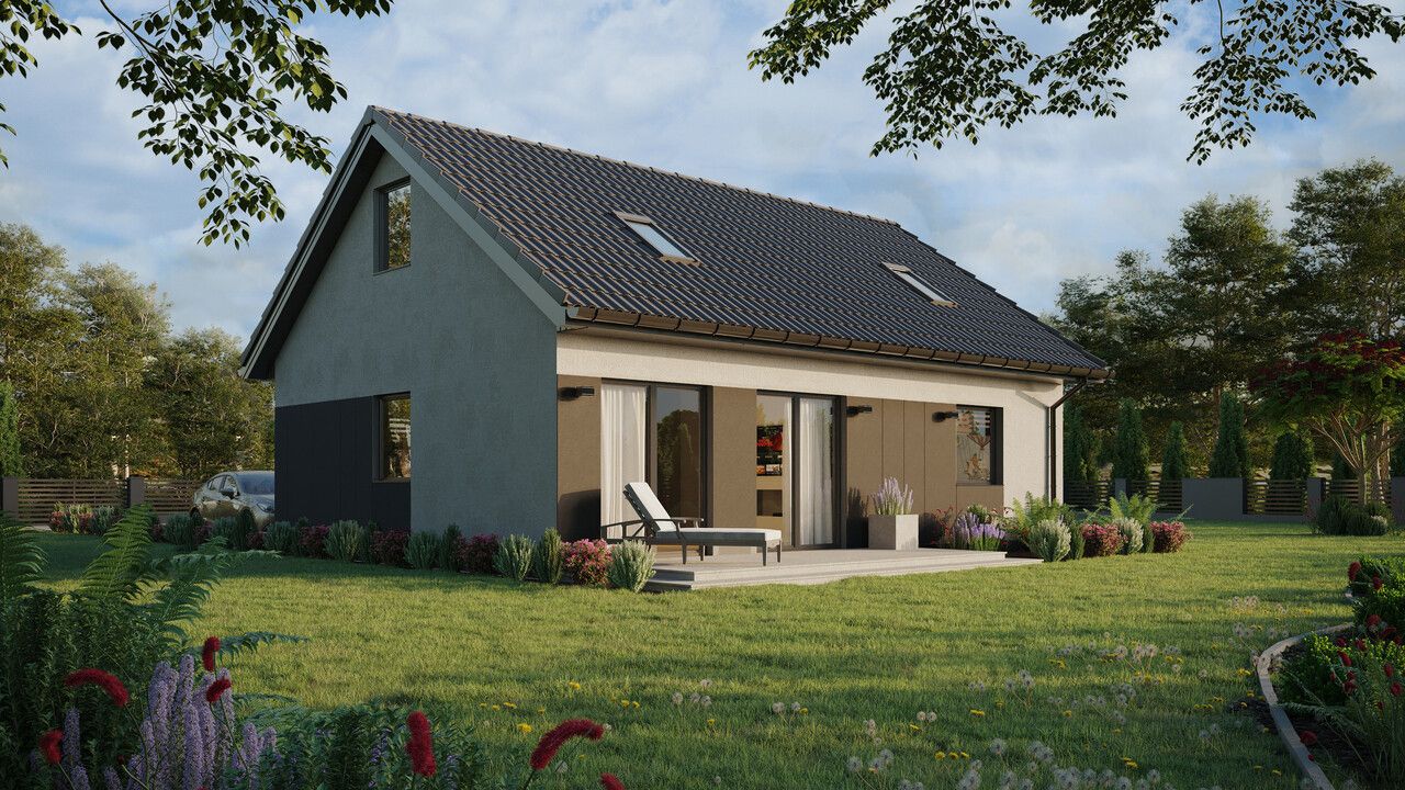 ERDOL 1 XL in der gewählten Konfiguration hat ein Satteldach mit nutzbarem Dachgeschoss mit einer Neigungswinkel 35 Grad und ist mit EUROCOLOR SYNEGO PVC-Tischlerarbeiten auf einem 80 mm breiten Profil der Marke REHAU in den Farben Anthrazit ausgestattet.