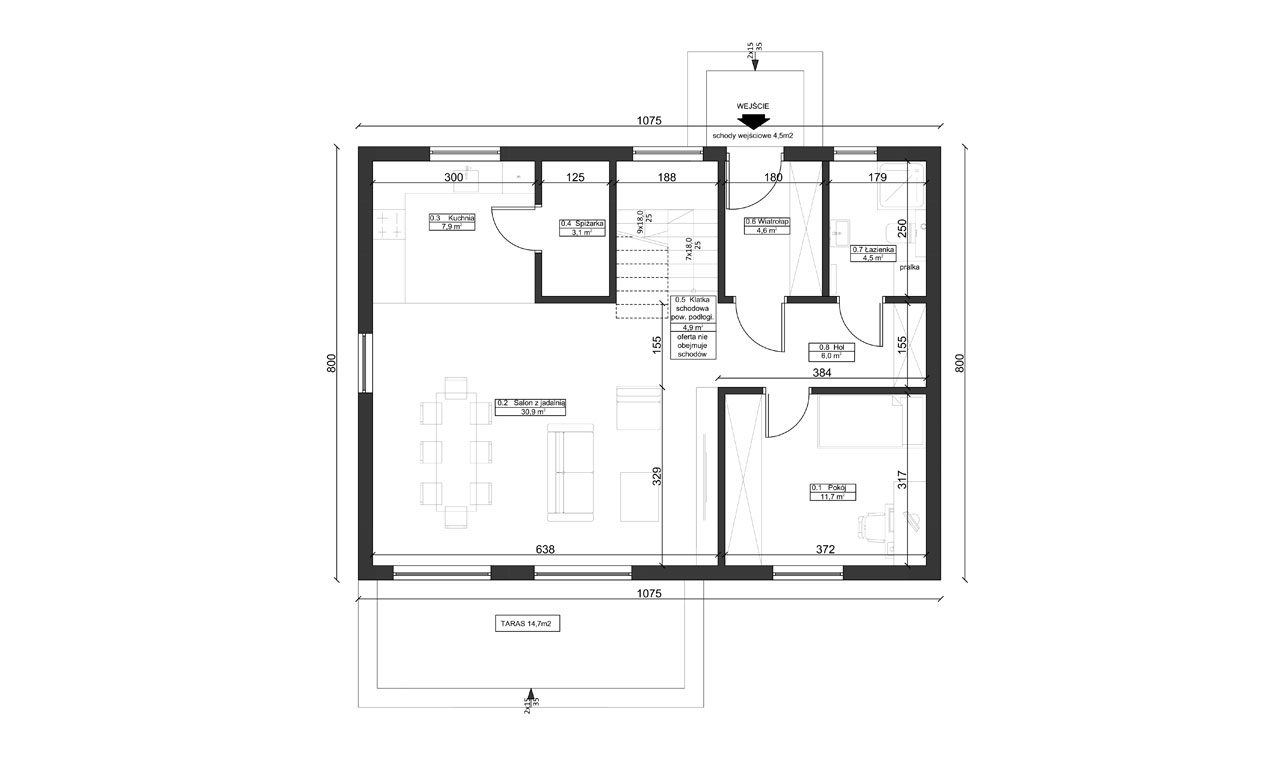 Das Haus ERDOL 1 XL ist eine erweiterte Version des Hauses ERDOL 1. Das Haus mit einer Fläche von 74 m² (116 m² in der Version mit nutzbarem Dachgeschoss) bietet seinen Bewohnern einen komfortablen Raum, in dem alles, was sie brauchen, ist. Seine geringe Größe macht es einfach und kostengünstig in der Instandhaltung. Für den Bau wird KVH-Holz verwendet, das die Grundlage der gesamten Struktur bildet. Dank energiesparender Lösungen Planung verhindert es Energieverluste und ist umweltfreundlich.