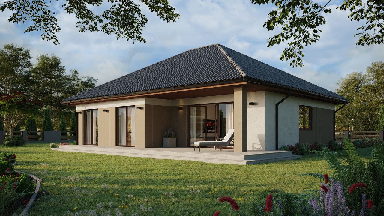 ERDOL 104, wie der Name schon sagt, hat 104 m² (plus 25 m² Dachboden) Wohnfläche. Es ist eine gute Wahl für Menschen, die ein kleines, aber sehr funktionelles Haus in einer optisch attraktiven Form mit einem eleganten Walmdach suchen. Für den alltäglichen Komfort sorgen u.a. 2 Bäder und eine Terrasse mit einem Laubengang am Eingang, dank dem man bei jedem Wetter gerne nach draußen geht. Neben dem Komfort ist das Haus auch ökologisch - die Instandhaltungskosten wurden durch den Einsatz moderner Lösungen und Materialien, die die Innenräume wirksam vor Wärmeverlusten schützen, auf ein Minimum reduziert.
