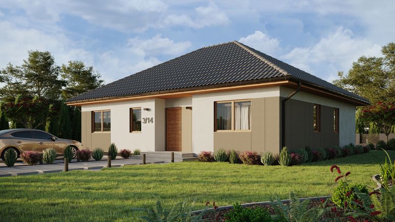 ERDOL 104, wie der Name schon sagt, hat 104 m² (plus 25 m² Dachboden) Wohnfläche. Es ist eine gute Wahl für Menschen, die ein kleines, aber sehr funktionelles Haus in einer optisch attraktiven Form mit einem eleganten Walmdach suchen. Für den alltäglichen Komfort sorgen u.a. 2 Bäder und eine Terrasse mit einem Laubengang am Eingang, dank dem man bei jedem Wetter gerne nach draußen geht. Neben dem Komfort ist das Haus auch ökologisch - die Instandhaltungskosten wurden durch den Einsatz moderner Lösungen und Materialien, die die Innenräume wirksam vor Wärmeverlusten schützen, auf ein Minimum reduziert.