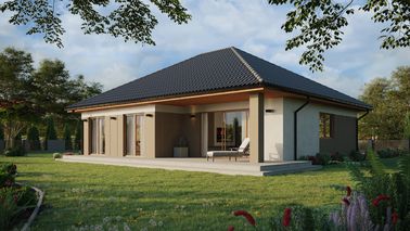 ERDOL 104, wie der Name schon sagt, hat 104 m² (plus 25 m² Dachboden) Wohnfläche. Es ist eine gute Wahl für Menschen, die ein kleines, aber sehr funktionelles Haus in einer optisch attraktiven Form mit einem eleganten Walmdach suchen. Für den alltäglichen Komfort sorgen u.a. 2 Bäder und eine Terrasse mit einem Laubengang am Eingang, dank dem man bei jedem Wetter gerne nach draußen geht. Neben dem Komfort ist das Haus auch ökologisch - die Instandhaltungskosten wurden durch den Einsatz moderner Lösungen und Materialien, die die Innenräume wirksam vor Wärmeverlusten schützen, auf ein Minimum reduziert.