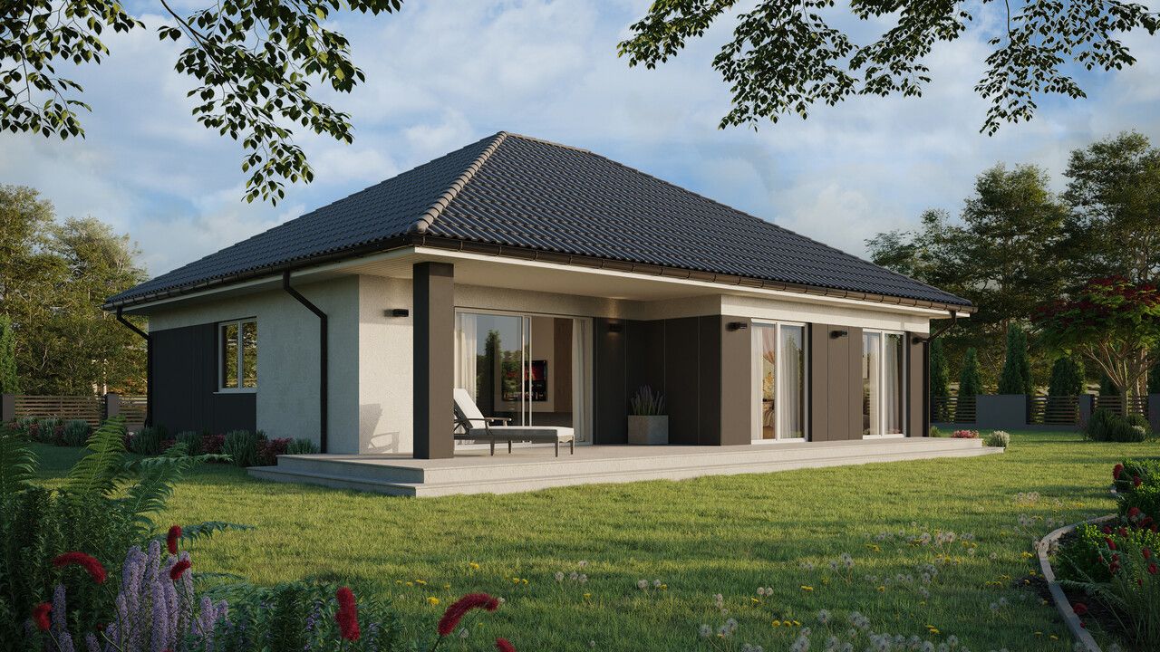 ERDOL 104, wie der Name schon sagt, hat 104 m² (plus 25 m² Dachboden) Wohnfläche. Es ist eine gute Wahl für Menschen, die ein kleines, aber sehr funktionelles Haus in einer optisch attraktiven Form mit einem eleganten Walmdach suchen. Für den alltäglichen Komfort sorgen u.a. 2 Bäder und eine Terrasse mit einem Laubengang am Eingang, dank dem man bei jedem Wetter gerne nach draußen geht. Neben dem Komfort ist das Haus auch ökologisch - die Instandhaltungskosten wurden durch den Einsatz moderner Lösungen und Materialien, die die Innenräume wirksam vor Wärmeverlusten schützen, auf ein Minimum reduziert.