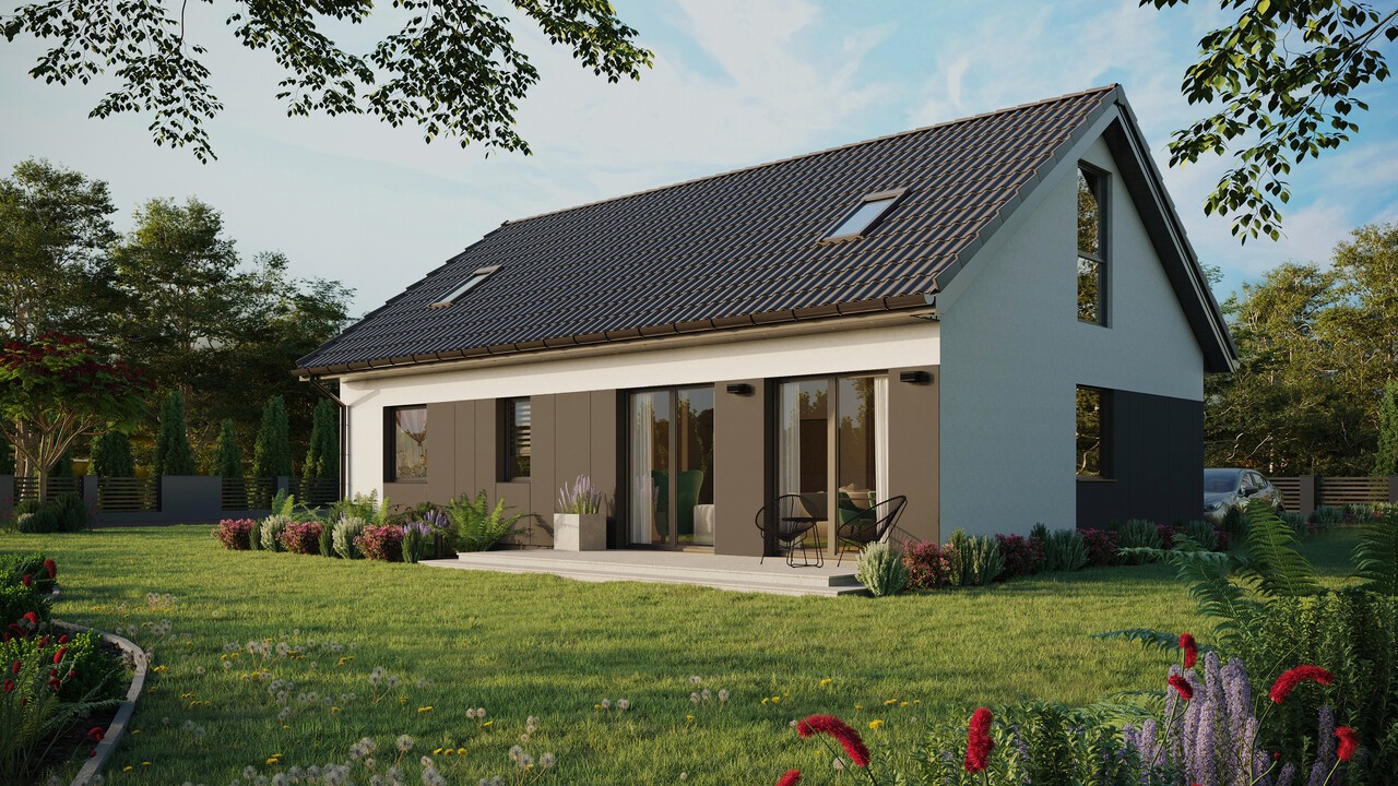 Das Haus ERDOL 2 XL mit einer Fläche von 82 m² (130 m² bei einem Projekt mit nutzbarem Dachgeschoss) ist eine erweiterte Version des Hauses ERDOL 2. Es ist eine perfekte Lösung für alle Menschen, die in ihrem Haus keine große Anzahl an Zimmern benötigen, aber den zusätzlichen Raum nutzen möchten, um mehr Platz für komfortables Arbeiten zu gewinnen. Die in diesem Projekt verwendeten modernen Technologien und ökologischen Lösungen machen es zu einem energieeffizienten Haus, das im Einklang mit der Natur funktioniert. Für den Bau wird KVH-Holz verwendet, das die Grundlage der gesamten Struktur bildet. Entsprechend ausgewählte Dämmstoffe sorgen dafür, dass das Haus vor Wärmeverlusten geschützt ist.