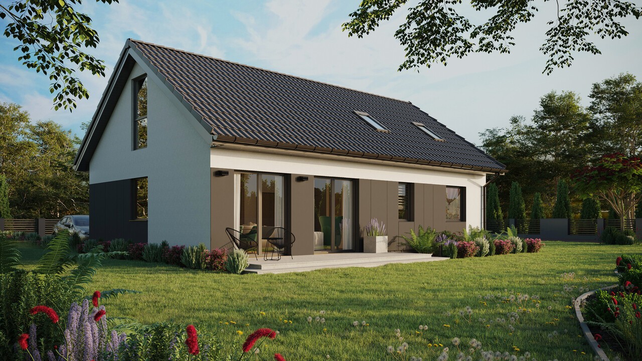 Das Haus ERDOL 2 XL mit einer Fläche von 82 m² (130 m² bei einem Projekt mit nutzbarem Dachgeschoss) ist eine erweiterte Version des Hauses ERDOL 2. Es ist eine perfekte Lösung für alle Menschen, die in ihrem Haus keine große Anzahl an Zimmern benötigen, aber den zusätzlichen Raum nutzen möchten, um mehr Platz für komfortables Arbeiten zu gewinnen. Die in diesem Projekt verwendeten modernen Technologien und ökologischen Lösungen machen es zu einem energieeffizienten Haus, das im Einklang mit der Natur funktioniert. Für den Bau wird KVH-Holz verwendet, das die Grundlage der gesamten Struktur bildet. Entsprechend ausgewählte Dämmstoffe sorgen dafür, dass das Haus vor Wärmeverlusten geschützt ist.