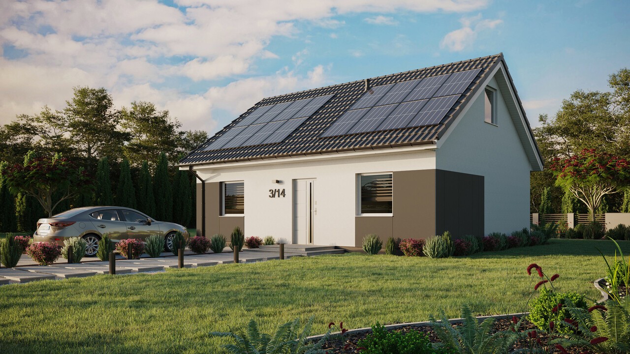 ERDOL 2 in der gewählten Konfiguration hat ein Satteldach mit nutzbarem Dachgeschoss mit einer Neigungswinkel 35 Grad und ist mit EUROCOLOR SYNEGO PVC-Tischlerarbeiten auf einem 80 mm breiten Profil der Marke REHAU in den Farben Weiß ausgestattet.