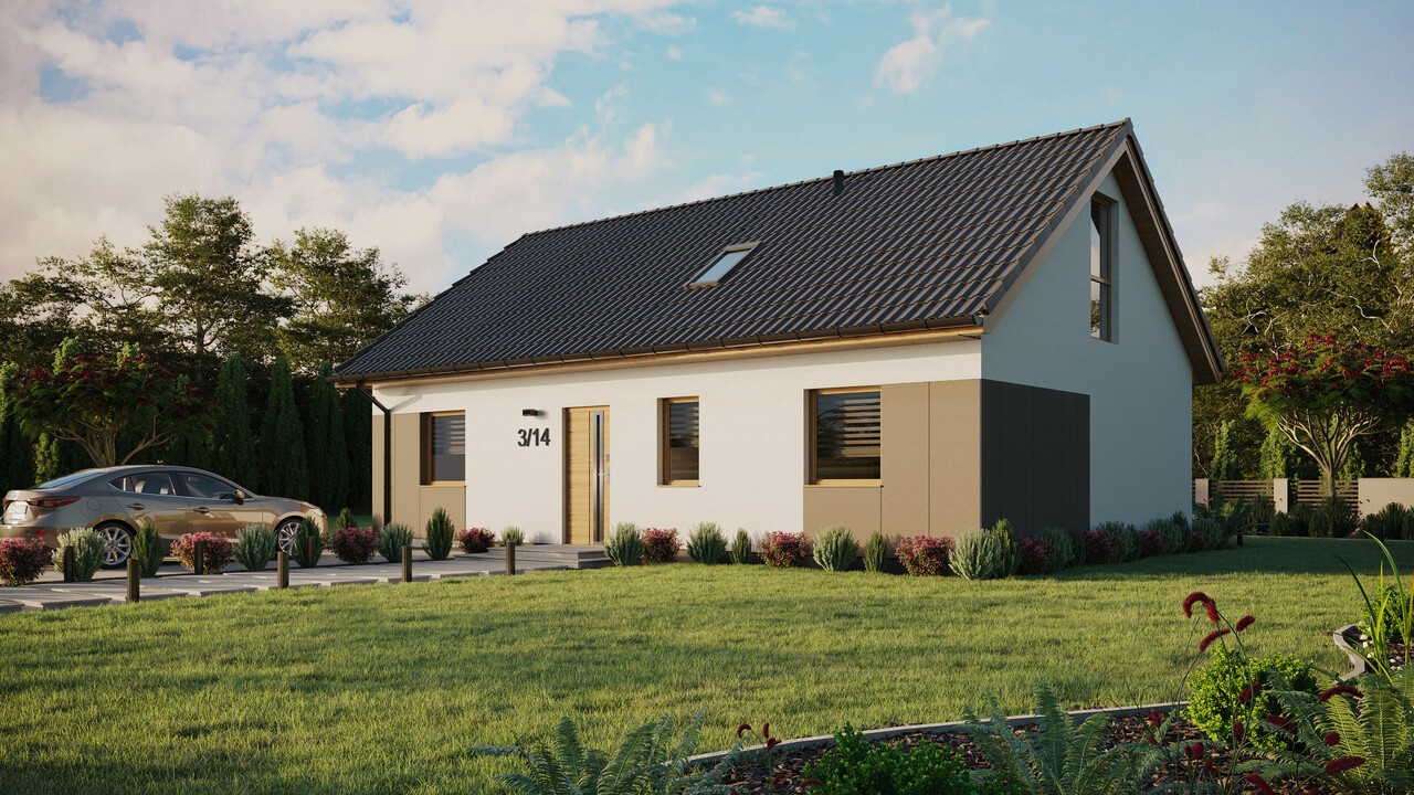 ERDOL 3 in der gewählten Konfiguration hat ein Satteldach mit nutzbarem Dachgeschoss mit einer Neigungswinkel 35 Grad und ist mit EUROCOLOR SYNEGO PVC-Tischlerarbeiten auf einem 80 mm breiten Profil der Marke REHAU in den Farben Winchester ausgestattet.