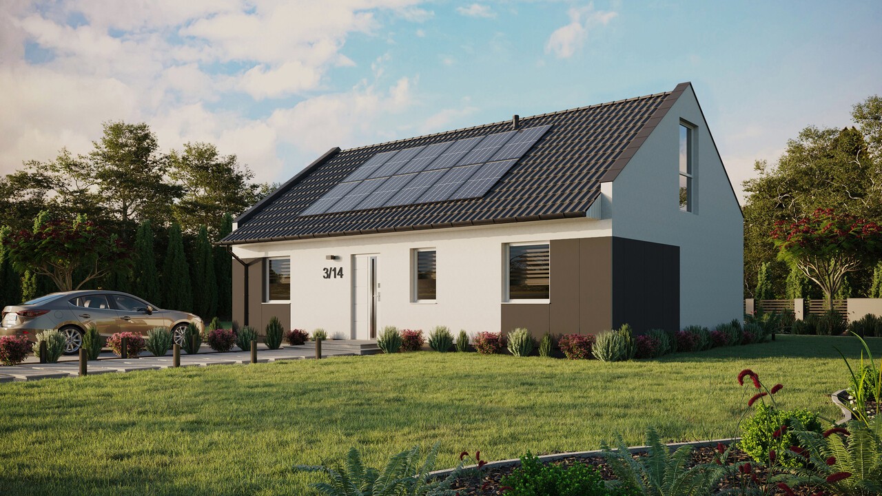 Das Projekt ERDOL 3 Haus mit einer Fläche von 82 m² (130 m² in der Version mit nutzbarem Dachgeschoss) wurde so konzipiert, dass das Gebäude seinen Bewohnern komfortable und geräumige Innenräume bietet, in denen alles Platz hat, was sie brauchen. Die eingesetzten modernen Technologien und ökologischen Lösungen machen es zu einem energieeffizienten Haus, das im Einklang mit der Natur funktioniert. Für den Bau wird KVH-Holz verwendet, das die Grundlage der gesamten Struktur bildet. Entsprechend ausgewählte Dämmstoffe sorgen dafür, dass das Haus vor Wärmeverlusten geschützt ist.