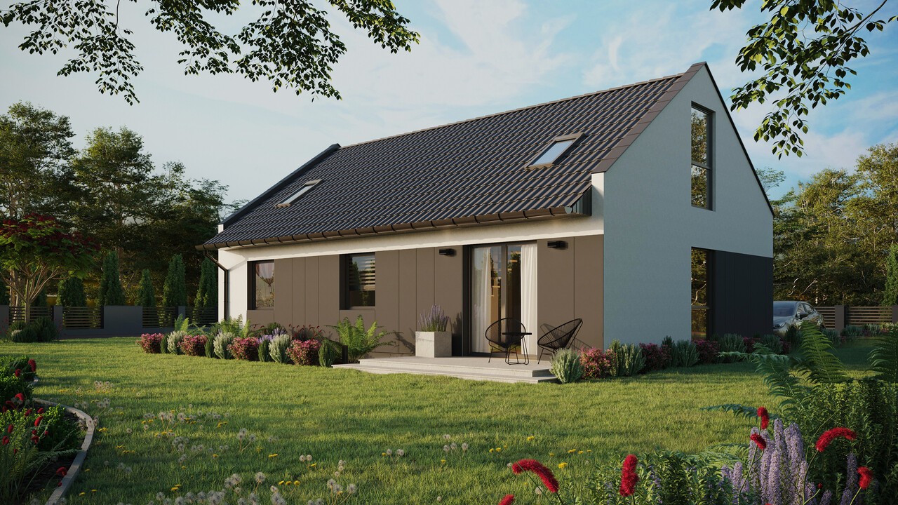 Das Projekt ERDOL 3 Haus mit einer Fläche von 82 m² (130 m² in der Version mit nutzbarem Dachgeschoss) wurde so konzipiert, dass das Gebäude seinen Bewohnern komfortable und geräumige Innenräume bietet, in denen alles Platz hat, was sie brauchen. Die eingesetzten modernen Technologien und ökologischen Lösungen machen es zu einem energieeffizienten Haus, das im Einklang mit der Natur funktioniert. Für den Bau wird KVH-Holz verwendet, das die Grundlage der gesamten Struktur bildet. Entsprechend ausgewählte Dämmstoffe sorgen dafür, dass das Haus vor Wärmeverlusten geschützt ist.