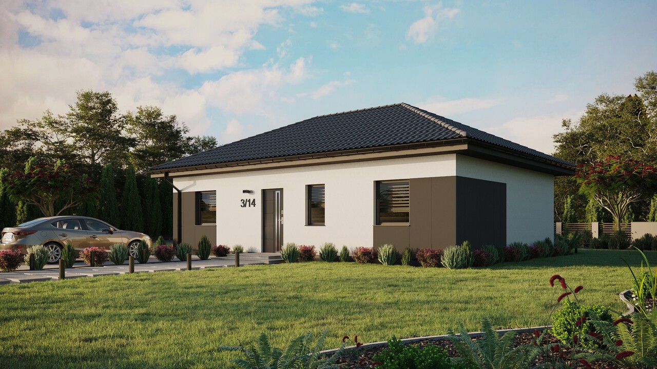 ERDOL 3 in der gewählten Konfiguration hat ein Walmdach mit nutzbaren Dachboden und einer Neigung von 25 Grad und ist mit EUROCOLOR SYNEGO PVC-Tischlerarbeiten auf einem 80 mm breiten Profil der Marke REHAU in den Farben Anthrazit ausgestattet.