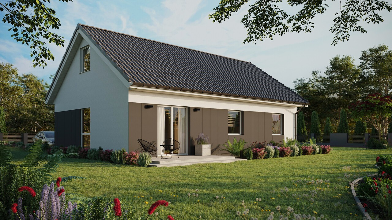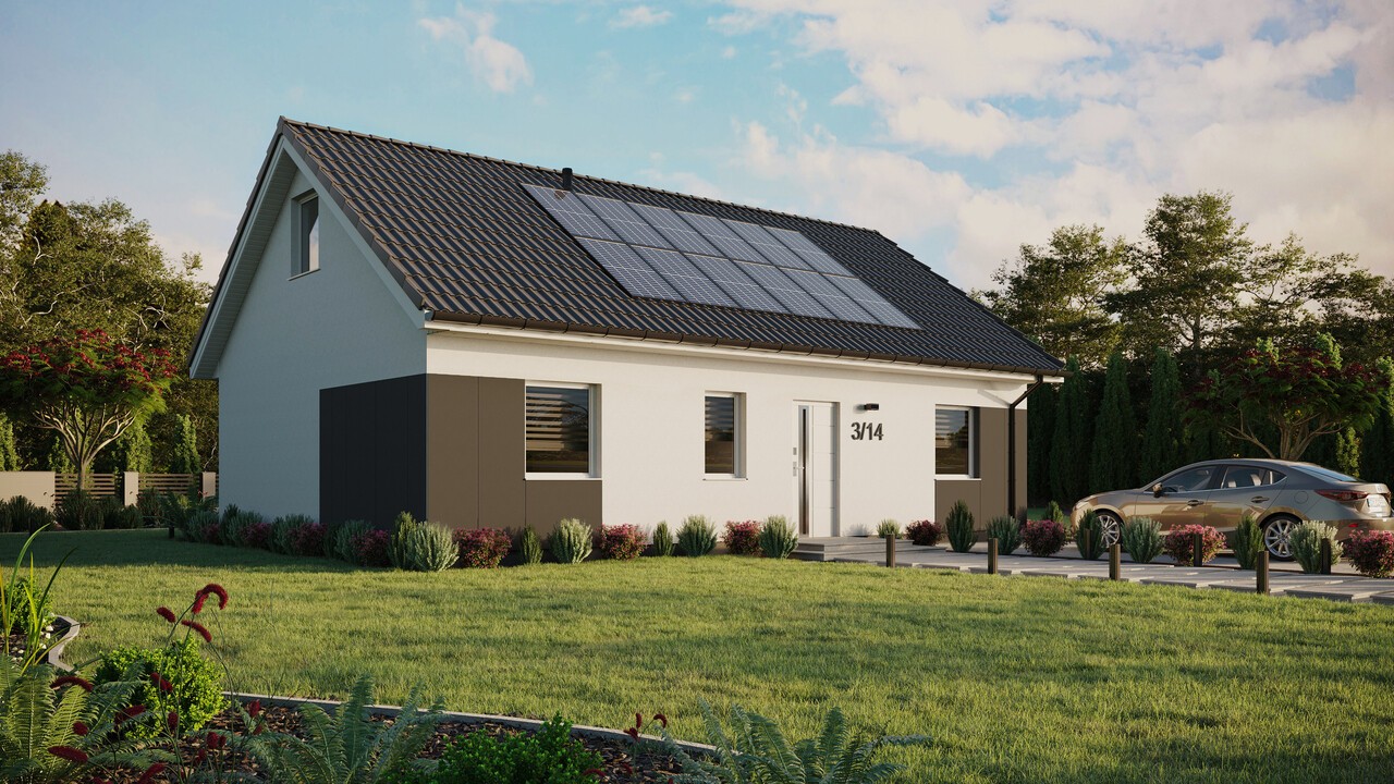 ERDOL 3 in der gewählten Konfiguration hat ein Satteldach mit nutzbarem Dachgeschoss mit einer Neigungswinkel 35 Grad und ist mit EUROCOLOR SYNEGO PVC-Tischlerarbeiten auf einem 80 mm breiten Profil der Marke REHAU in den Farben Weiß ausgestattet.